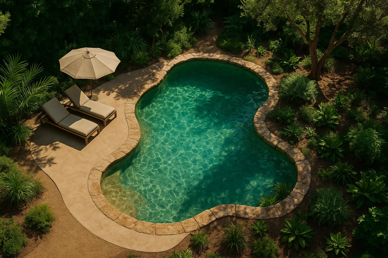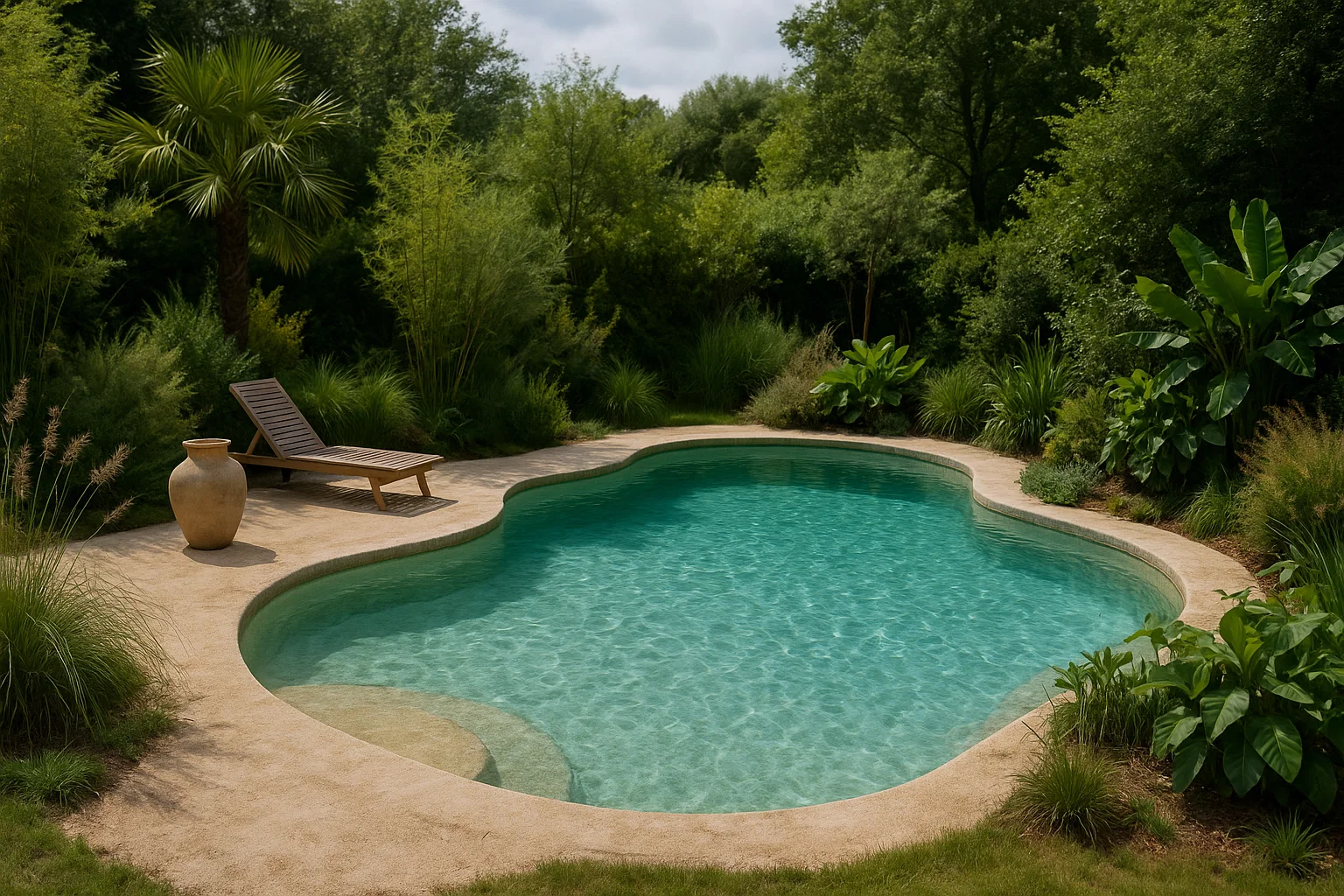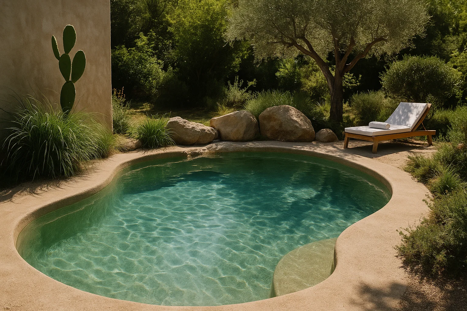 Des formes libres, des matières brutes, une nature qui s’invite. Une piscine vivante, presque sauvage, comme une île intime au fond du jardin.